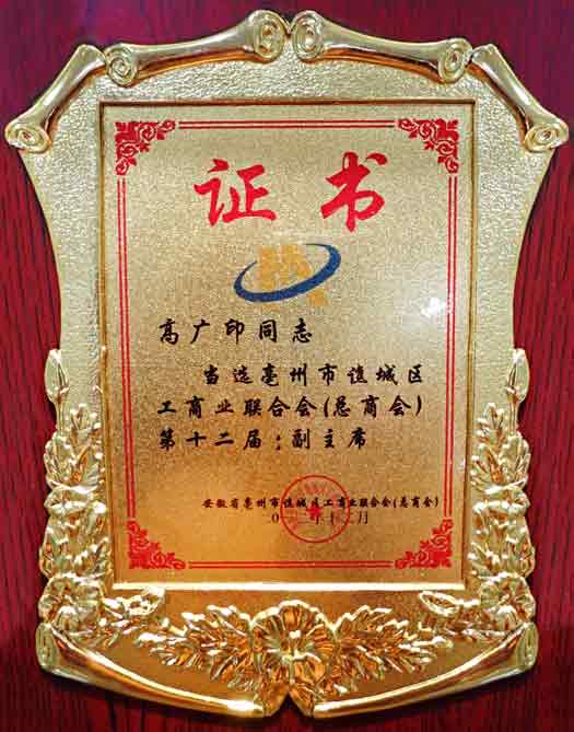 On December 26, resident Gao Guangyin was elected vice chairman of Federation of Industry and Commerce of the twelfth session of Qiaocheng District, and president Gao will shoulder more social responsibility and participate in the policy affairs for the economy development in Qiaocheng district.