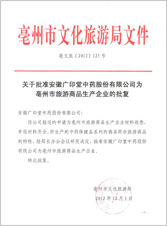 According to the culture tourism travel notification of bozhou city [2012]125:GUANGYINTANG was approved as the Bozhou City tourism commodity production enterprise.