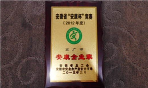 Anhui Provincial Federation of Trade Unions and Provincial Safety Supervision Bureau: on the recognition of 2012 yearly Anhui province “Ankang Cup” contest advanced collectives and individuals, and president Gao Guangyin was awarded the title of “Ankang entrepreneur” in Anhui province. President Gao Guangyin is the only entrepreneur who has won this honor in Bozhou city.