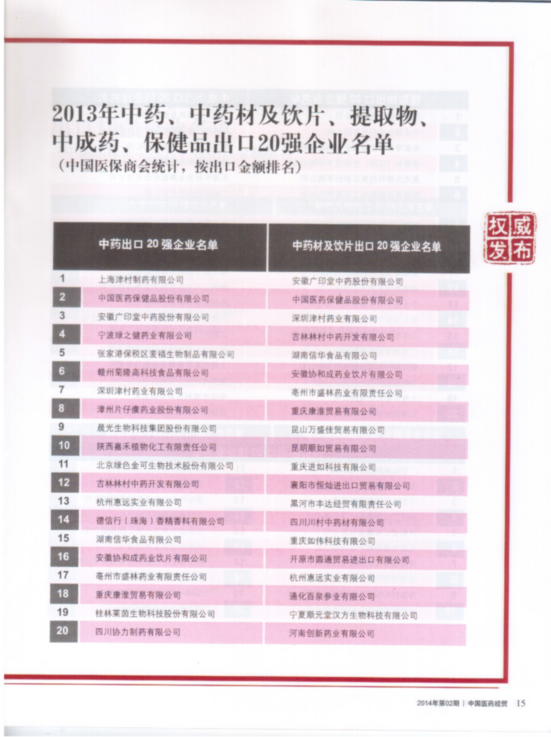 In 2013 GYT ranked the top three in the top 20 of export Chinese medicine