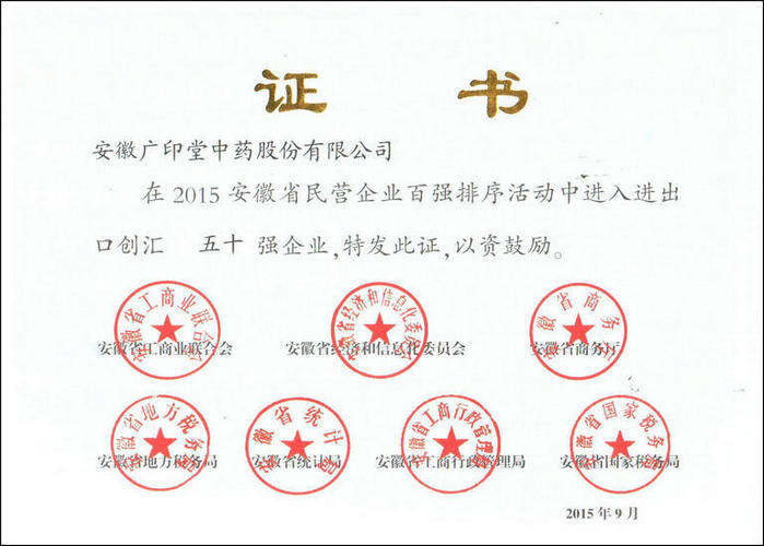 Anhui GYT Chinese Medicine Co.,Limited winning the honor of 2015 Anhui Provincial fifty strong enterprises among private enterprises in one hundred ranking in imports and exports.