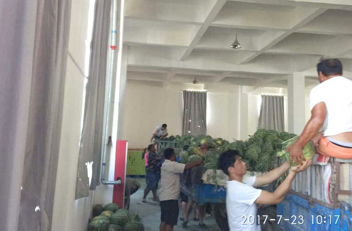On 23rd of July, the burning sun made the temperature reach 38℃. Loaded with 10000 kilograms of watermelons 5 motor tricycles of melon farmers from Zhaoqiao Town came into company's warehouse. They unloaded watermelons and count the income with laugh. They are grateful for GYT's sincere help. This year expanded watermelon's planting area made price decrease. Consequently they are difficult to sell. District government called up the mass to help melon farmers.
