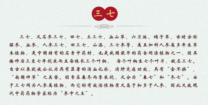 本品為五加科植物三七Panax notoginseng (Burk.)F.H.Chen的干燥根和根莖。秋季花開前采挖,洗凈,分開主根、支根及根莖,干燥。支根習(xí)稱“筋條”,根莖習(xí)稱“剪口”。