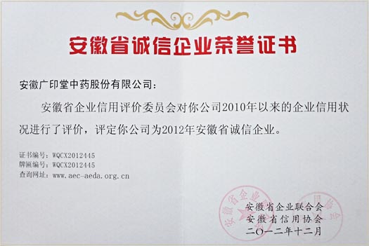 安徽廣印堂中藥股份有限公司榮獲安徽省誠信企業(yè)殊榮