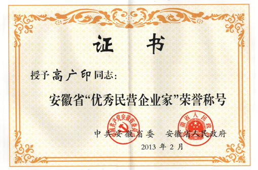 2013年2月,中共安徽省委、安徽省人民政府,授予安徽廣印堂中藥股份有限公司董事長高廣印同志安徽省 “優(yōu)秀民營企業(yè)家”榮譽稱號。