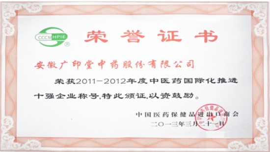 廣印堂被甄選為2012年度中醫(yī)藥國(guó)際化推進(jìn)十強(qiáng)領(lǐng)軍企業(yè)
