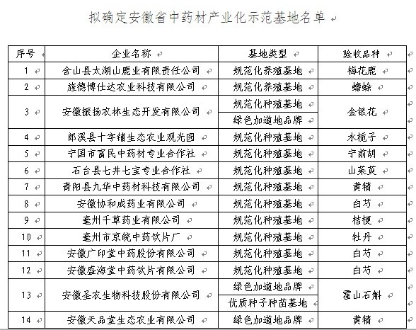 根據(jù)省局《關(guān)于開展中藥材產(chǎn)業(yè)化示范基地考核驗收工作的通知》(皖食藥監(jiān)辦〔2012〕280號)的有關(guān)規(guī)定和要求,經(jīng)考核評定,我省12家企業(yè)的基地被認定為“安徽省中藥材規(guī)范化種植(養(yǎng)殖)基地”。