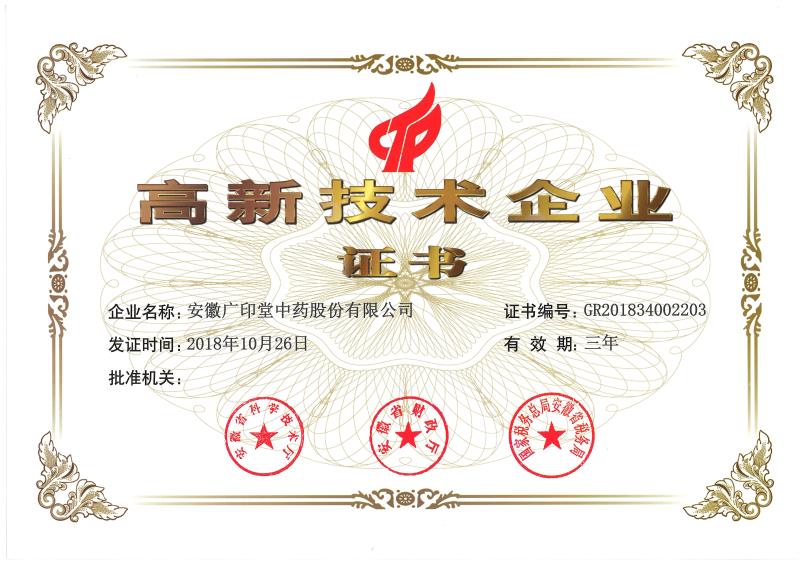 經(jīng)安徽省科技廳、安徽財(cái)政廳、國(guó)家稅務(wù)總局安徽省稅務(wù)局審核評(píng)定,安徽廣印堂中藥股份有限公司通過(guò)認(rèn)證,再度榮獲“高新技術(shù)企業(yè)”稱(chēng)號(hào)。